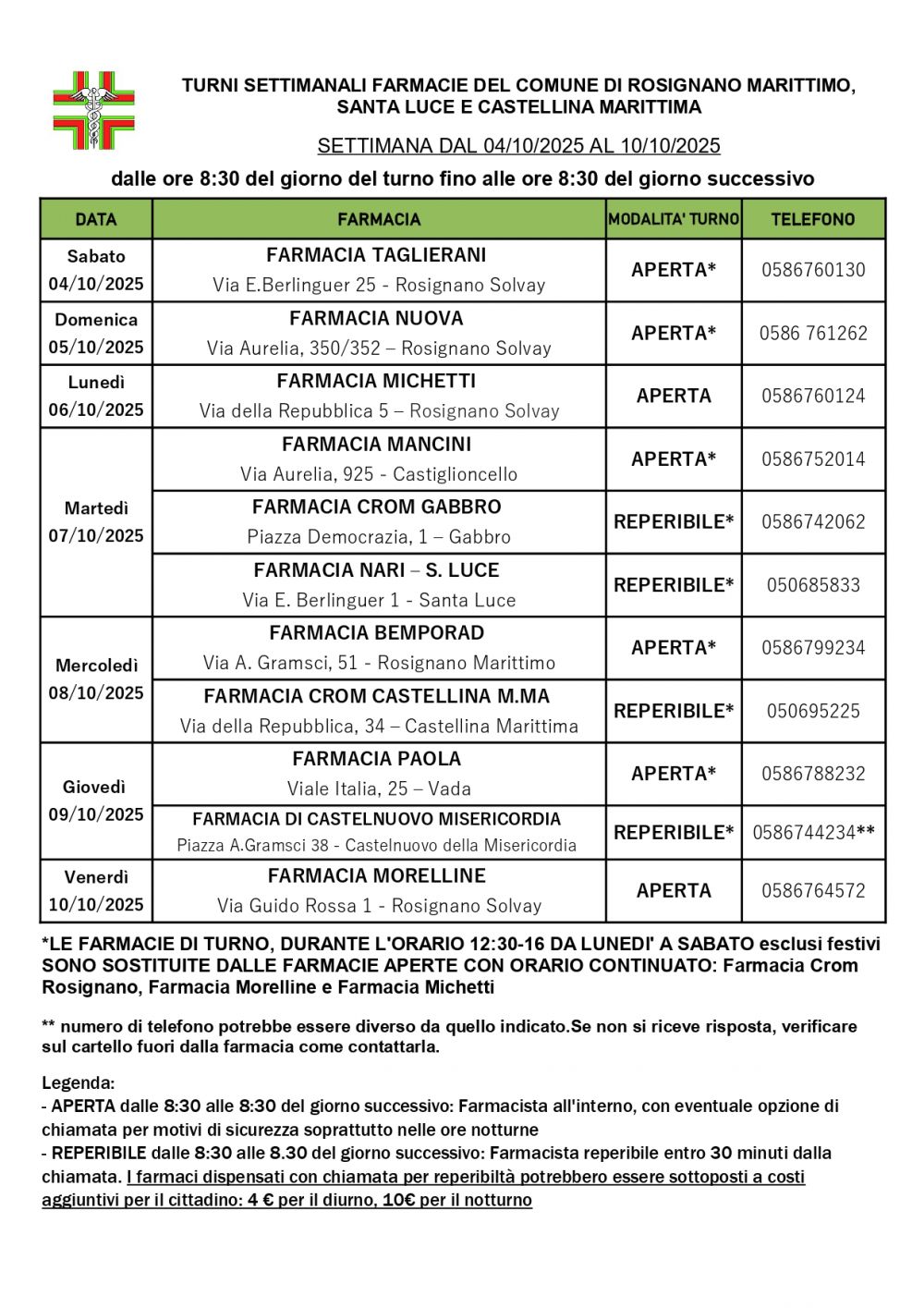 Turni Rosignano Marittimo - dal 04/10/2025 al 10/10/2025