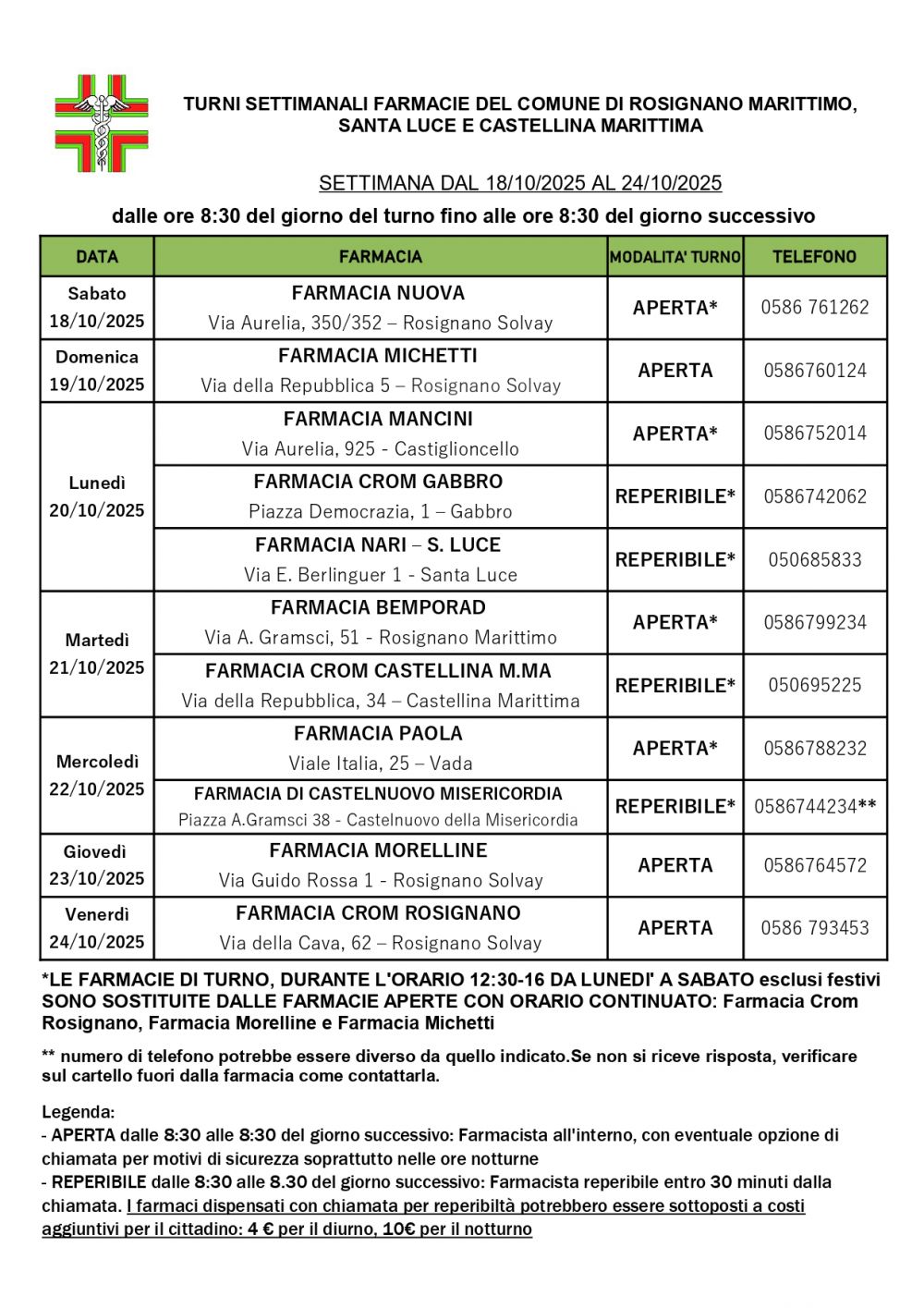 Turni Rosignano Marittimo - dal 18/10/2025 al 24/10/2025