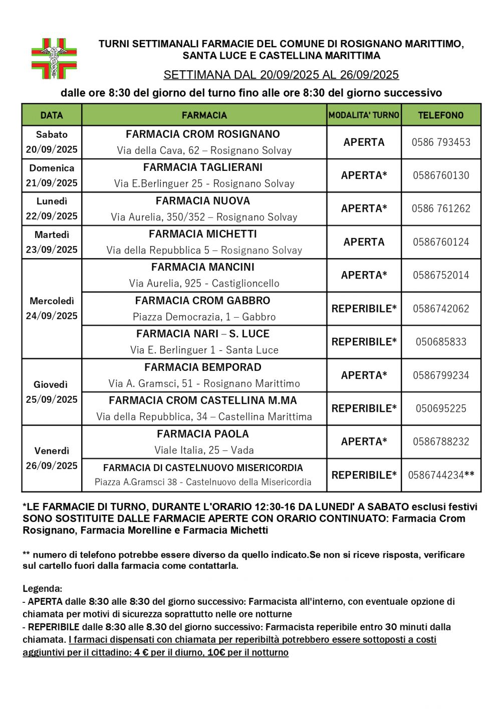 Turni Rosignano Marittimo - dal 20/09/2025 al 26/09/2025