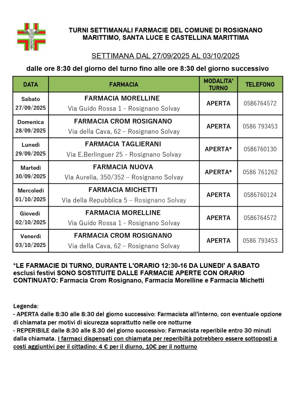 Turni Rosignano Marittimo - dal 27/09/2025 al 03/10/2025