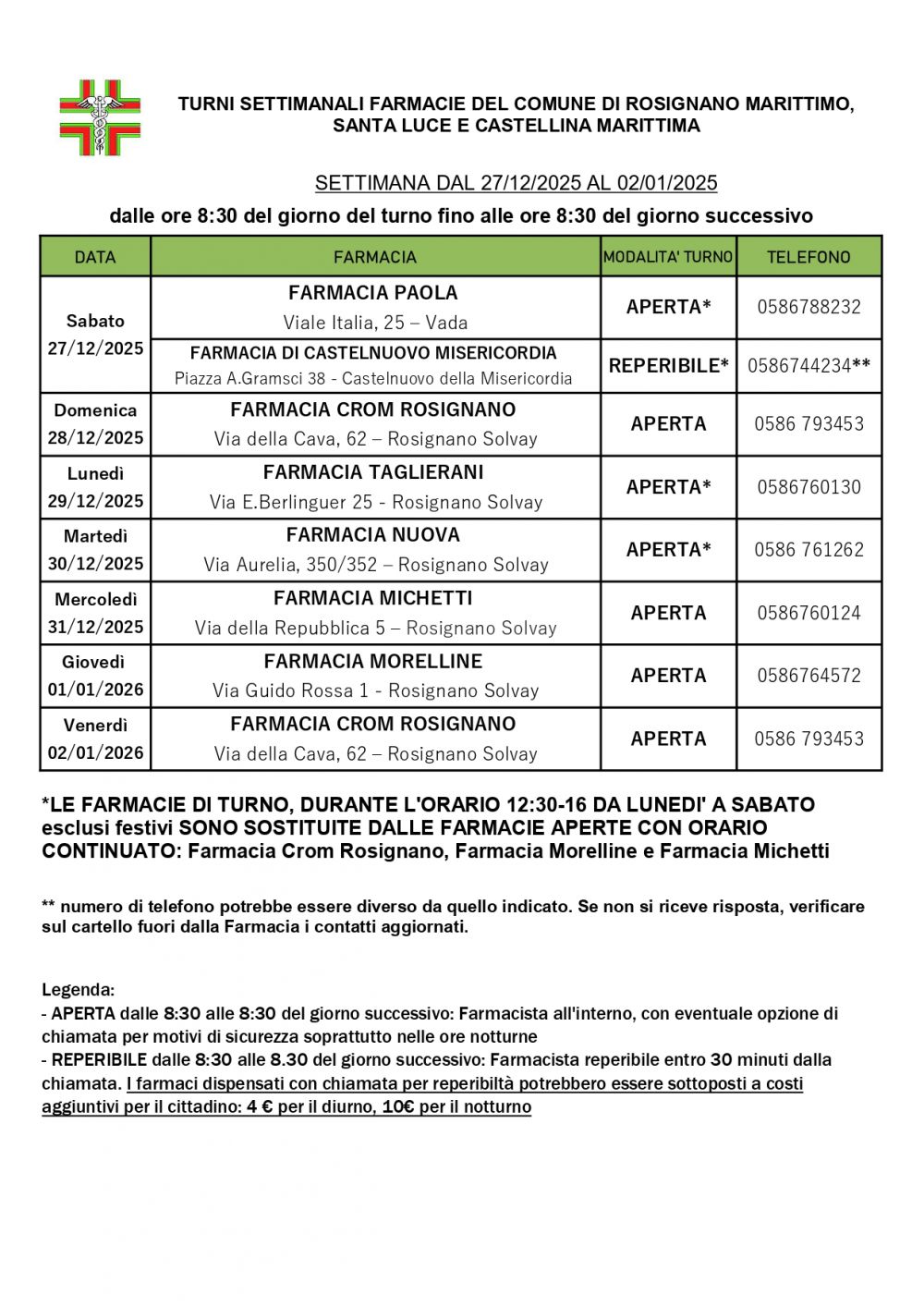 Turni Rosignano Marittimo - dal 27/12/2025 al 02/01/2026