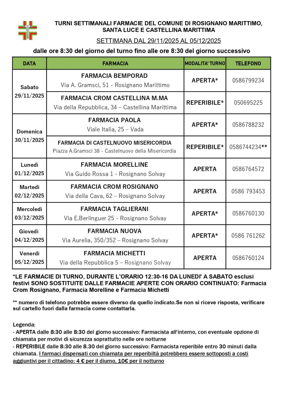 Turni Rosignano Marittimo - dal 29/11/2025 al 05/12/2025