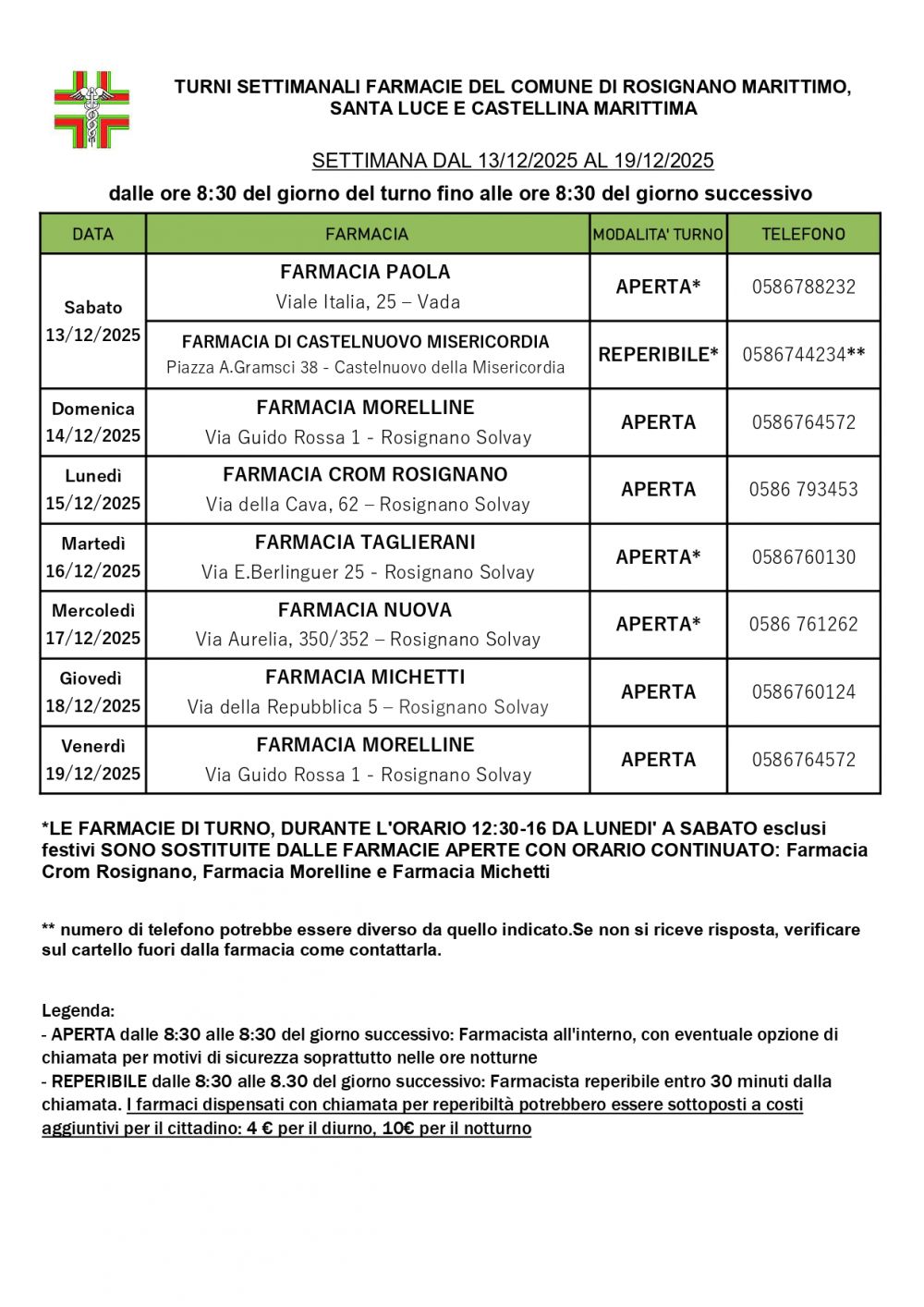 Turni Rosignano Marittimo - dal 13/12/2025 al 19/12/2025