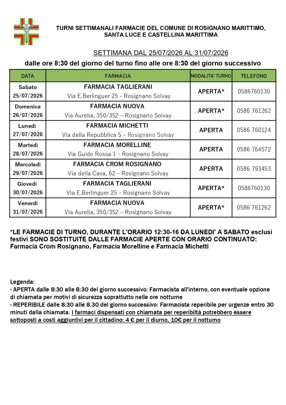 Turno Rosignano dal 25/07/2026 al 31/07/2026