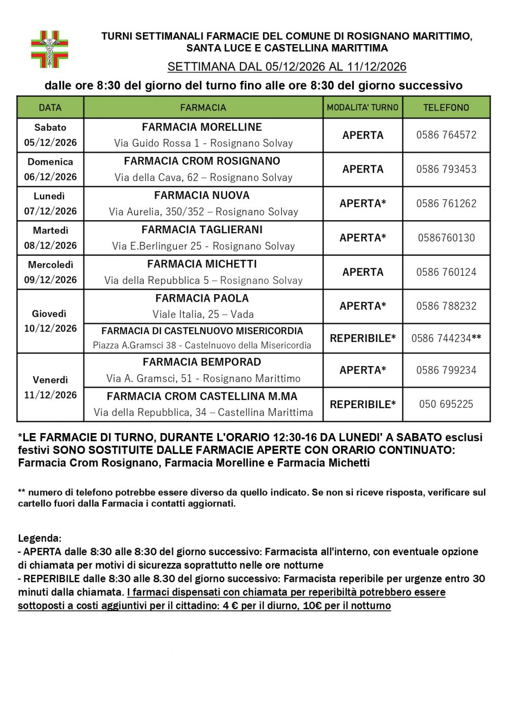 Turno Rosignano dal 05/12/2026 dal 11/12/2026