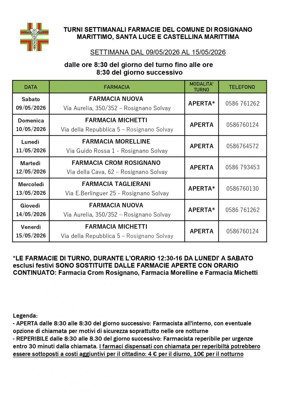 Turno Rosignano dal 09/05/2026 al 15/05/2026