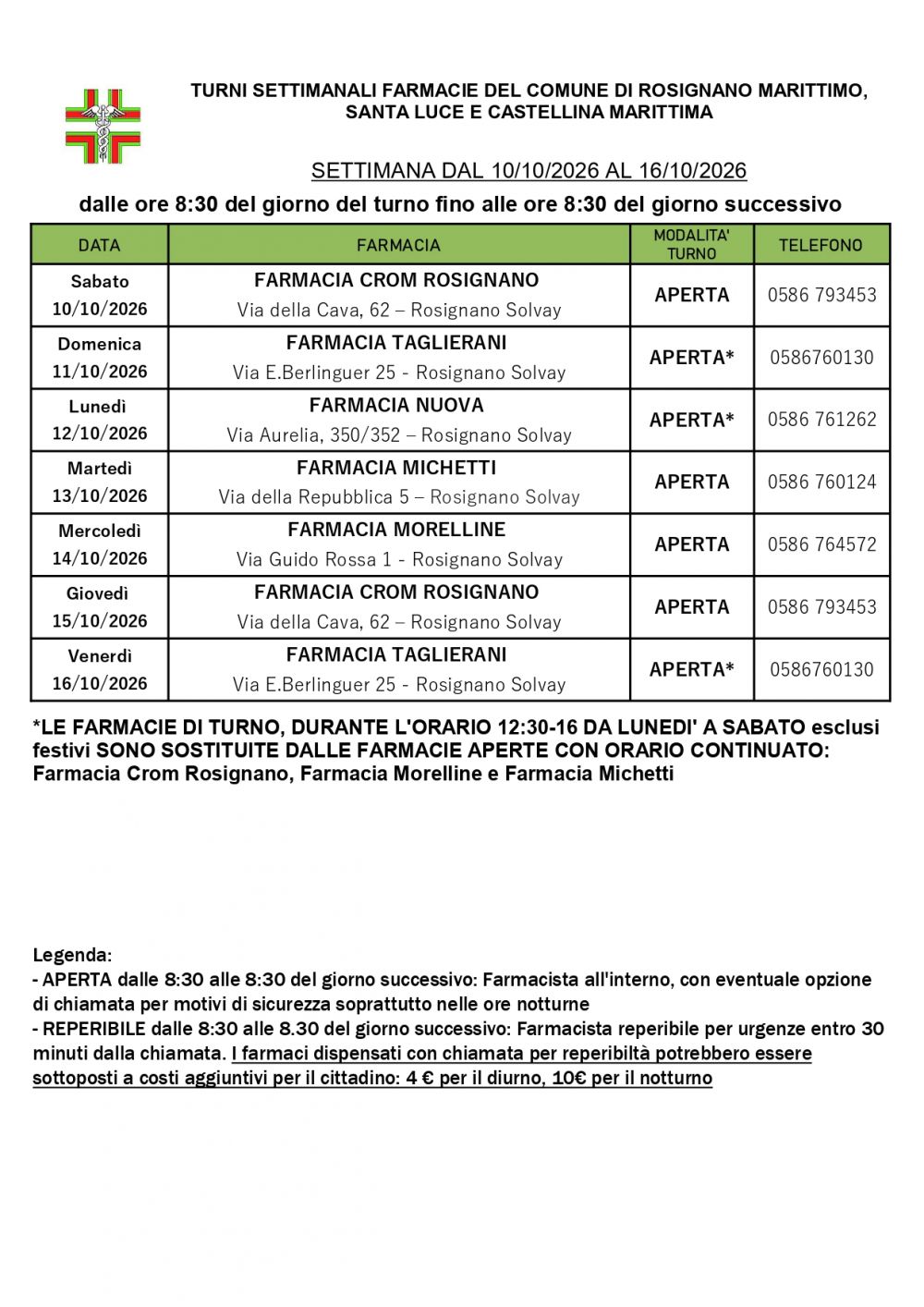 Turno Rosignano dal 10/10/2026 al 16/10/2026