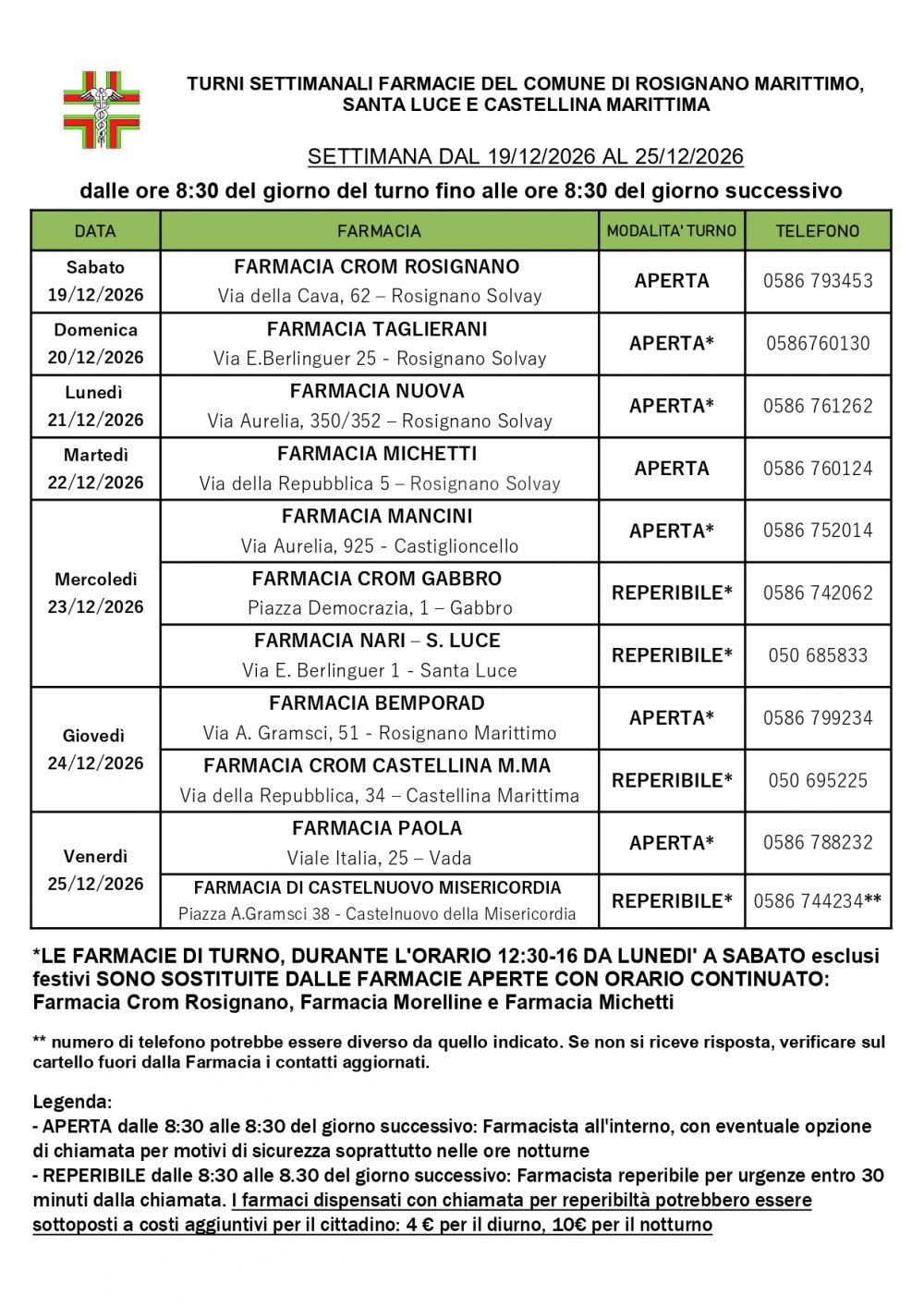 Turno Rosignano dal 19/12/2026 al 25/12/2026