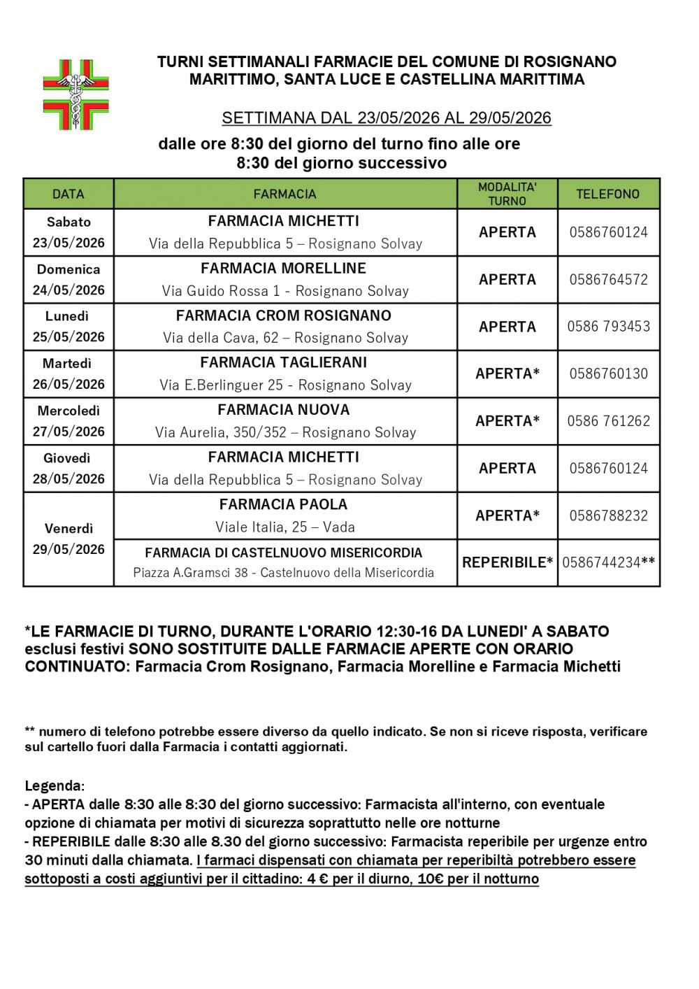 Turno Rosignano dal 23/05/2026 al 29/05/2026