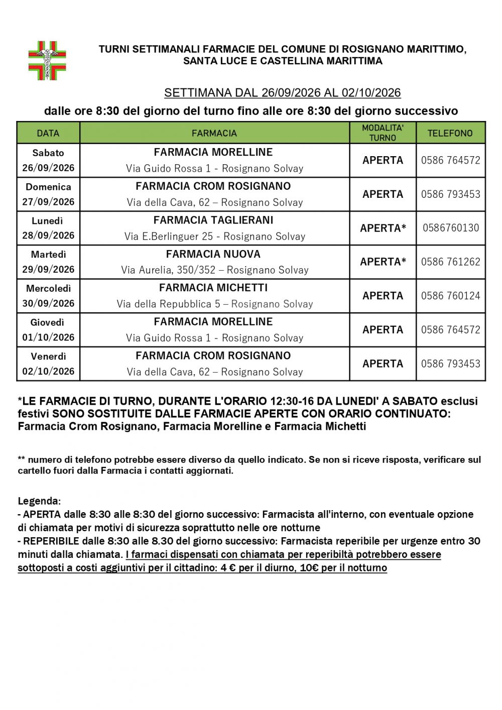 Turno Rosignano dal 26/09/2026 al 02/10/2026