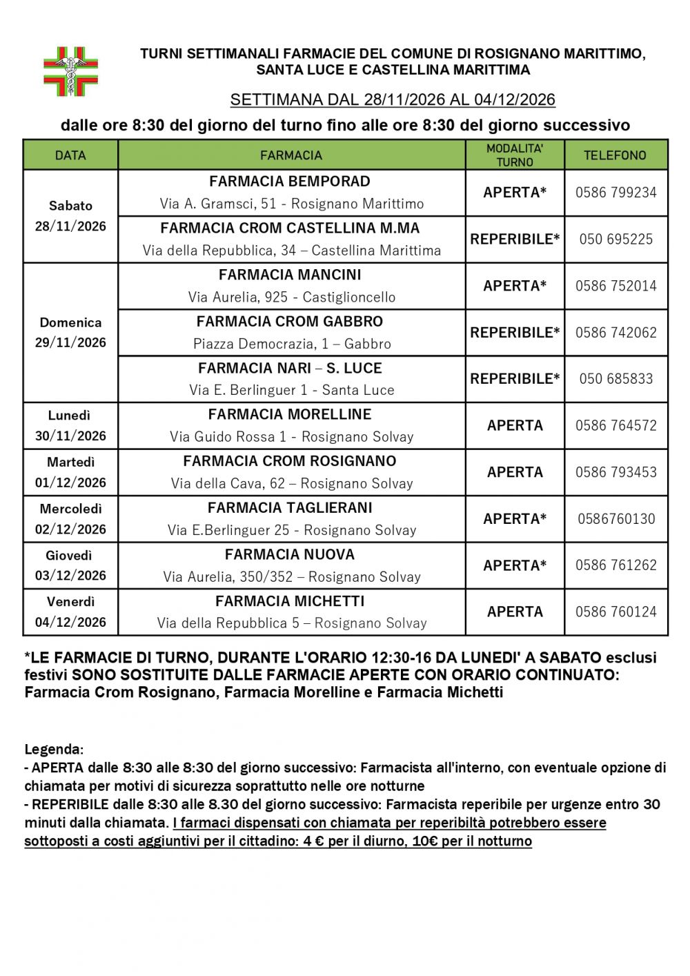 Turno Rosignano dal 28/11/2026 al 04/12/2026