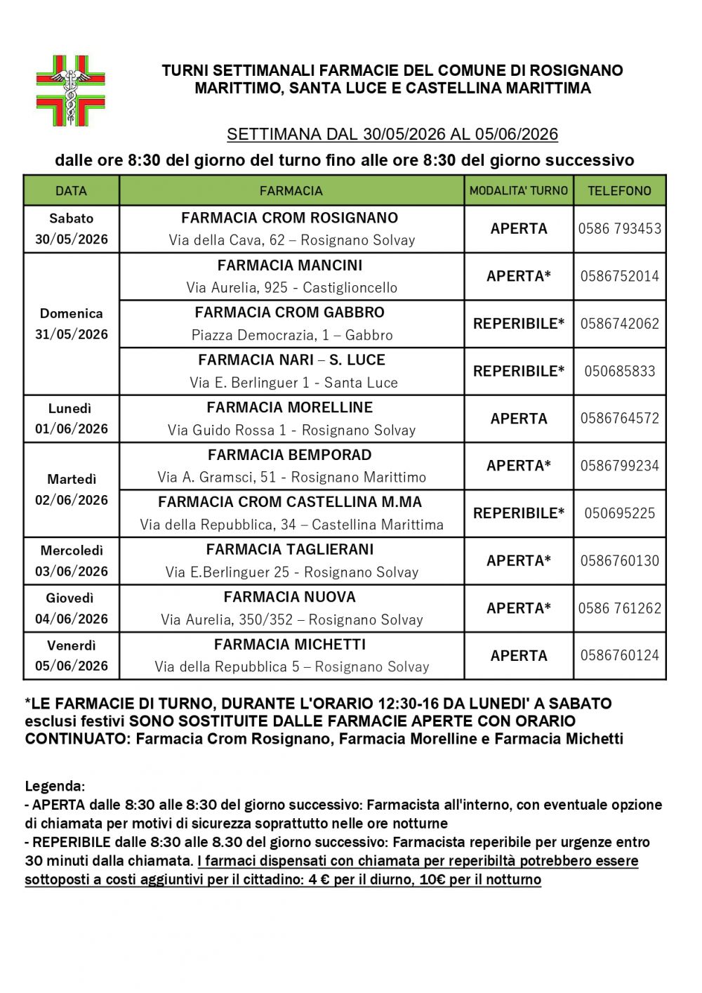 Turno Rosignano dal 30/05/2026 al 05/06/2026