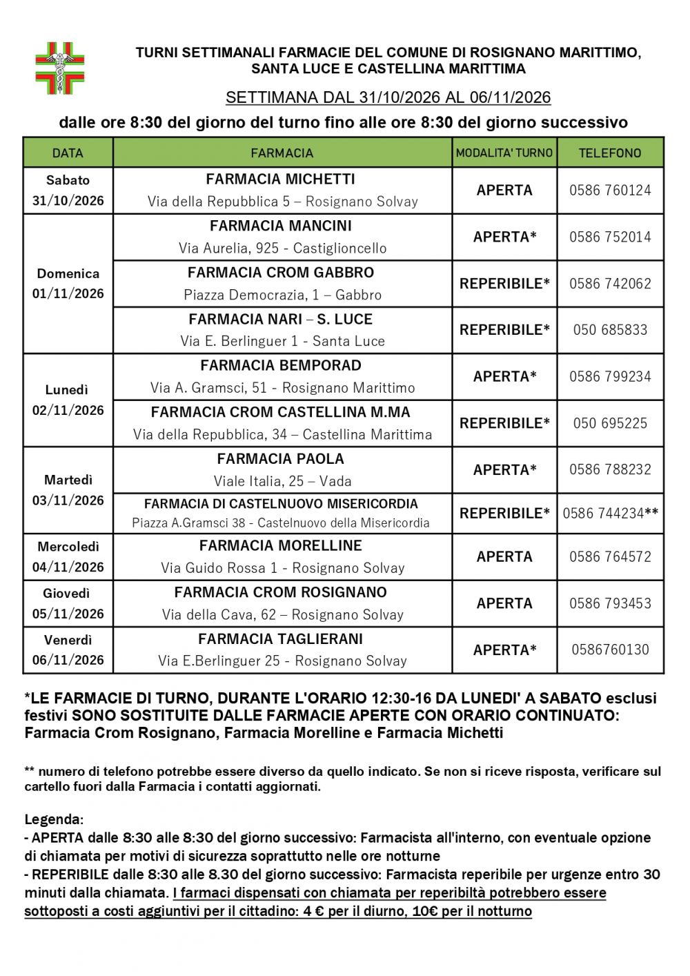 Turno Rosignano dal 31/10/2026 al 06/11/2026