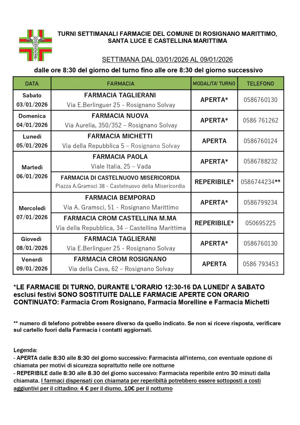 Turno Rosignano Marittimo dal 03/01/2026 al 09/01/2026
